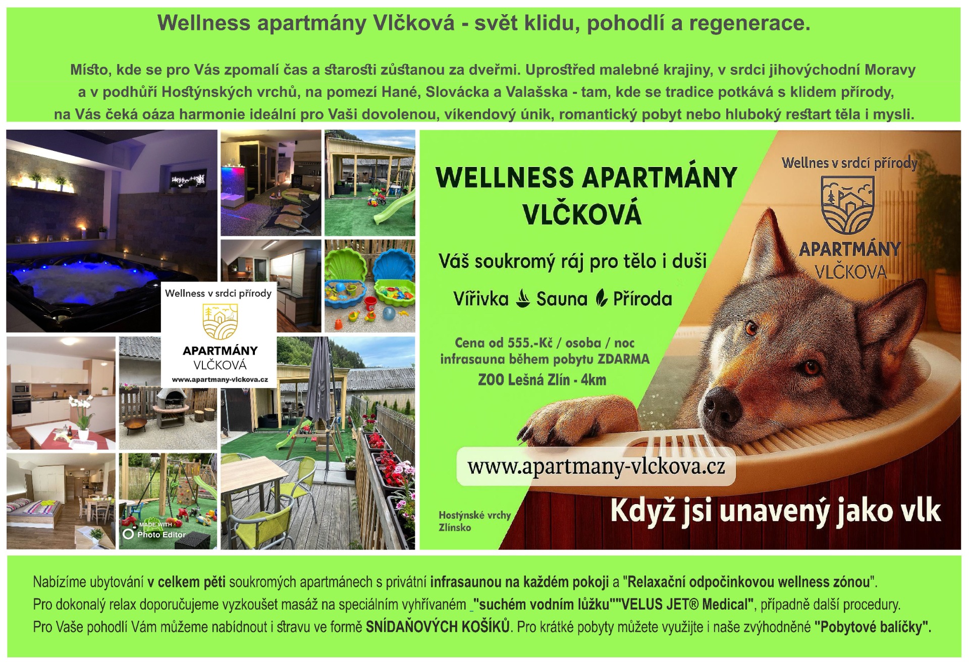Ubytování v celkem pěti soukromých apartmánech s privátní infrasaunou na pokoji a pro všechny apartmány společnou "Relaxační odpočinkovou wellness zónou", kterou je možné navštívít i privátně a rezervovat si ji pouze pro Vás. Pro regeneraci těla můžete využít naši masáž na speciálním vyhřívaném "suchém vodním lůžku" VELUS JET® Medical za zaváděcí zvýhodněné ceny. Pro Vaše pohodlí a relax Vám můžeme nabídnout stravu ve formě SNÍDAŇOVÝCH KOŠÍKŮ.